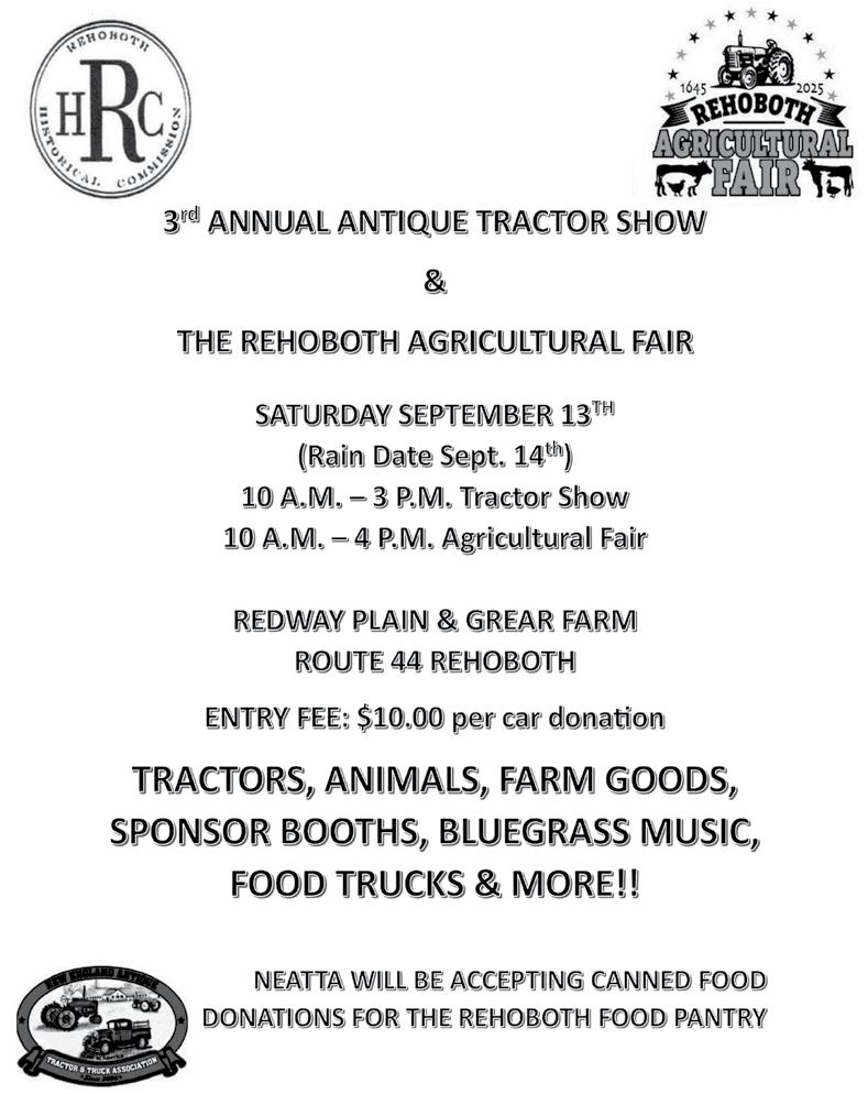 Hello All ~ I hope you are enjoying your summer! A friendly reminder, real estate taxes were due Friday, August 1, 2025. You may process your tax payment online @ https://www.invoicecloud.com/rehobothma, drop them off at town hall (340 Anawan Street) in the outside drop box (24/7), drop off at the Collector’s Office (hours Monday-Thursday 8-4 and Friday 8-Noon) please ring bell for service or mail to Treasurer/Tax Collector via US Post Office ~ thank you. If dropping off in the outside drop box, please make sure you put your invoice and payment in a sealed envelope to the attention of Treasurer/Tax Collector. Thank You ��