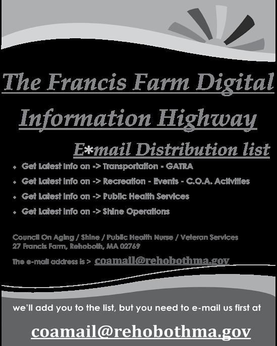 As time goes on, we will add other topics suggested by our seniors. (Dr. Christine Herald is planning to do a presentation on her ophthalmology service, hopefully in midJune) If you cannot come to the luncheons and want to make suggestion for other topics of interest, please call 508-962-4558 or e-mail ghamel@rehobothma.gov