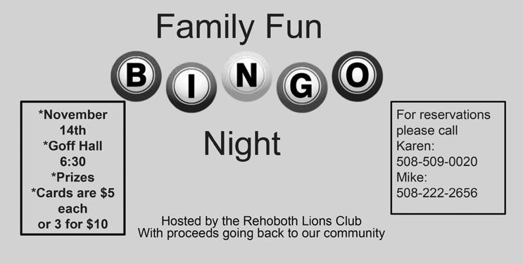 • Town Events Committee – Annual Lights Up Rehoboth begins Thanksgiving night. Participants can send a $10 donation to the event committee mailbox @ Town Hall to participate in the $750 prize-more details on website: https://www.rehobothma.gov/ town-events-committee