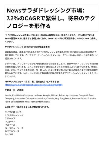 新たな主要セグメントと地域 主要マ ケットプレ ヤ による主要事業戦略とその主要⼿法 調査レポートは、グローバルおよび地域レベルでのサラダドレッシング市場の規模、シェア、傾 向、および成⻑分析を網羅しています。