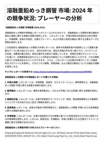この包括的な溶融亜鉛めっき鋼管の市場レポ トは、業界の利害関係者や投資家にとって重要な重 要なテ マに取り組んでいます。当社の分析では、現在の市場⼒学を深く掘り下げ、パンデミック の余波、消費者⾏動の変化、技術の進歩を注意深く調査しています。詳細な市場セグメンテーショ ンを通じて、利害関係者は各セグメントの特定の可能性について洞察を得ることができ、⼗分な情報 に基づいた投資決定を⾏うことができます。さらに、このレポ トは主要な市場プレーヤーの徹底 的なプロファイルを提供し、そのビジネス戦略、財務実績、および最近の動向についての微妙な理解 を提供します。
