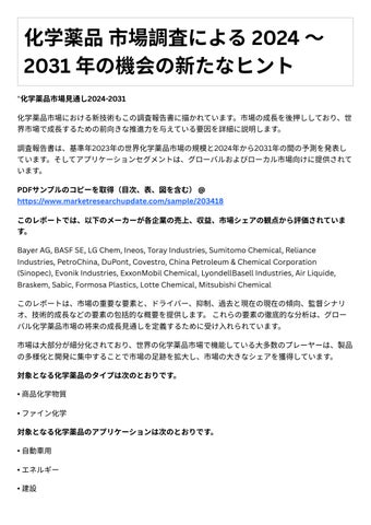 調査報告書は、基準年2023年の世界化学薬品市場の規模と2024年から2031年の間の予測を発表し ています。そしてアプリケーションセグメントは、グローバルおよびローカル市場向けに提供されて います。