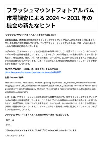 新たな主要セグメントと地域 主要マーケットプレーヤーによる主要事業戦略とその主要⼿法 調査レポ トは、グロ バルおよび地域レベルでのフラッシュマウントフォトアルバム市場の規 模、シェア、傾向、および成⻑分析を網羅しています。