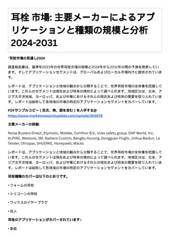 耳栓 市場: 主要メーカーによるアプ リケーションと種類の規模と分析 2024-2031 "耳栓市場の見通し2024 調査報告書は、基準年2023年の世界耳栓市場の規模と2024年から2031年の間の予測を発表してい ます。そしてアプリケーションセグメントは、グローバルおよびローカル市場向けに提供されていま す。 レポートは、アプリケーションと地域の観点から分類することで、世界耳栓市場の全体像を把握して います。これらのセグメントは現在および将来の傾向によって調べられます。地域区分は、北米、ア ジア太平洋地域、ヨーロッパ、および中東におけるそれらの現在および将来の需要を取り入れていま す。レポートは総称して各地域の市場の特定のアプリケーションセグメントをカバーしています。 PDFサンプルコピー(目次、表、図を含む)を入手する@ https://www.marketresearchupdate.com/sample/203078 主要メーカーの詳細: Noise Busters Direct, Etymotic, Moldex, Comfoor B.V., Uvex safety group, DAP World, Inc, ALPINE, Westone, 3M, Radians Custom, Bengbu Hucong, Dongguan Yingfa, Jinhua Baidun, La Tender, Ohropax, SHUERKE, Honeywell, Macks レポートは、アプリケーションと地域の観点から分類することで、世界耳栓市場の全体像を把握して います。これらのセグメントは現在および将来の傾向によって調べられます。地域区分は、北米、ア ジア太平洋地域、ヨーロッパ、および中東におけるそれらの現在および将来の需要を取り入れていま す。レポートは総称して各地域の市場の特定のアプリケーションセグメントをカバーしています。 耳栓種類のカバーは以下のとおりです。 • フォームの耳栓 • シリコーンの耳栓 • ワックスのイヤープラグ • 他人 耳栓のアプリケーションがカバーされています: • 家庭