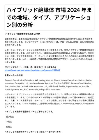 新たな主要セグメントと地域 主要マ ケットプレ ヤ による主要事業戦略とその主要⼿法 調査レポ トは、グロ バルおよび地域レベルでのハイブリッド絶縁体市場の規模、シェア、傾 向、および成⻑分析を網羅しています。