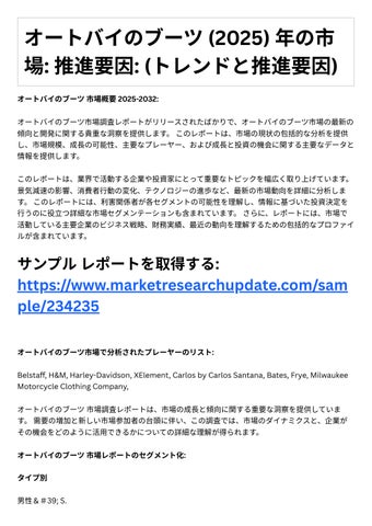 4. 投資機会: レポ トは、成⻑の可能性や競争環境など、オ トバイのブ ツ市場における投資機会 に関する情報を提供します。