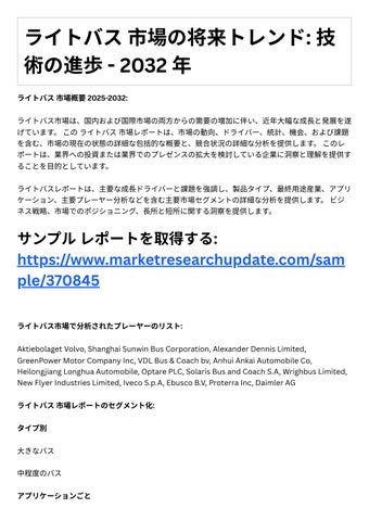 1. 市場の洞察: このレポ トは、市場規模、成⻑率、セグメンテ ション、競争環境など、ライトバ ス市場に関する貴重な洞察を提供します。