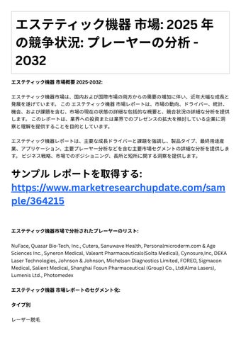 1. 市場の洞察: このレポートは、市場規模、成⻑率、セグメンテーション、競争環境など、エステテ ィック機器市場に関する貴重な洞察を提供します。