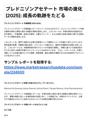 4. 投資機会: レポ トは、成⻑の可能性や競争環境など、プレドニゾンアセテ ト市場における投資 機会に関する情報を提供します。