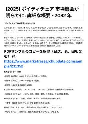 レポートは、プライマリおよびセカンダリの研究⽅法論を使⽤して収集されました。マーケットリ ダ 、ジャ ナル、出版物、会議、ホワイトペ パ とのインタビュ などの信頼できるソースか ら情報を収集しました。このレポ トでは、過去のデ タと市場の現在の動向を分析し、今後数年 間のグローバルなポイティチェア市場の公正な軌道の地図を提供します。 PDFサンプルのコピーを取得(⽬次、表、図を含 む) @ https://www.marketresearchupdate.com/sam ple/231352