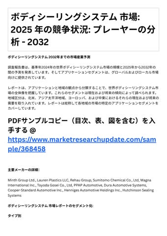 グローバルボディシーリングシステム市場に関する研究は、現在の市場シナリオと新たな成⻑の原動 ⼒について、重要かつ深い洞察を提供することを⽬指しています。ボディシーリングシステム市場に 関するレポ トでは、市場関係者だけでなく、新規参⼊企業にも市場の展望の全体像が提供されま す。包括的な調査は、確⽴されたプレーヤーだけでなく新興プレーヤーが彼らのビジネス戦略を確⽴ し、彼らの短期的および⻑期的⽬標を達成することを可能にするでしょう。