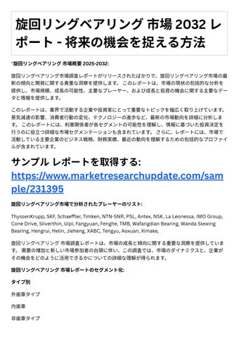 4. 投資機会: レポ トは、成⻑の可能性や競争環境など、旋回リングベアリング市場における投資機 会に関する情報を提供します。