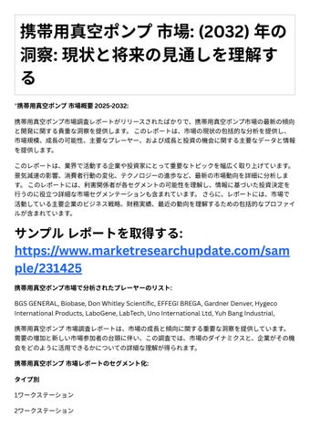 1. 市場の洞察: このレポ トは、市場規模、成⻑率、セグメンテ ション、競争環境など、携帯⽤真 空ポンプ市場に関する貴重な洞察を提供します。