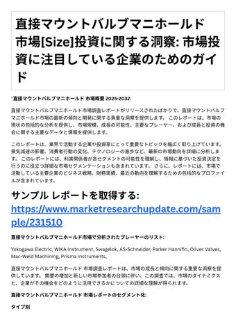4. 投資機会: レポートは、成⻑の可能性や競争環境など、直接マウントバルブマニホールド市場にお ける投資機会に関する情報を提供します。