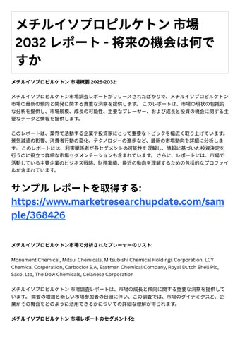 メチルイソプロピルケトン市場調査レポ トがリリ スされたばかりで、メチルイソプロピルケトン 市場の最新の傾向と開発に関する貴重な洞察を提供します。このレポ トは、市場の現状の包括的 な分析を提供し、市場規模、成⻑の可能性、主要なプレーヤー、および成⻑と投資の機会に関する主 要なデ タと情報を提供します。