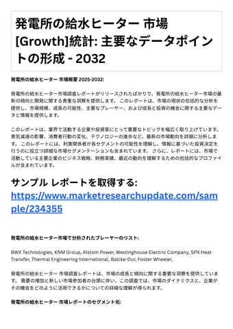 4. 投資機会: レポ トは、成⻑の可能性や競争環境など、発電所の給⽔ヒ タ 市場における投資機 会に関する情報を提供します。