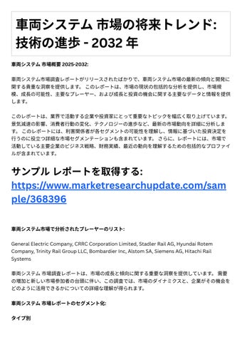 ⾞両システム市場調査レポートは、市場の成⻑と傾向に関する重要な洞察を提供しています。需要 の増加と新しい市場参加者の台頭に伴い、この調査では、市場のダイナミクスと、企業がその機会を どのように活⽤できるかについての詳細な理解が得られます。