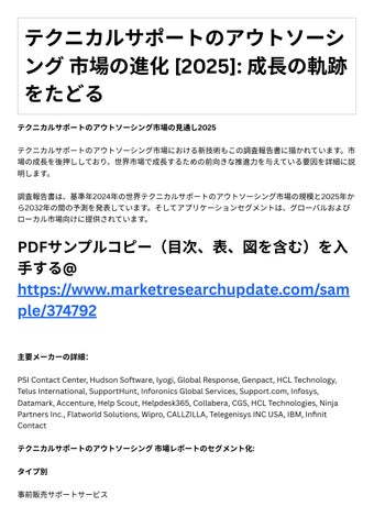 テクニカルサポ トのアウトソ シング市場における新技術もこの調査報告書に描かれています。市 場の成⻑を後押ししており、世界市場で成⻑するための前向きな推進⼒を与えている要因を詳細に説 明します。