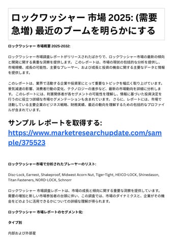 4. 投資機会: レポートは、成⻑の可能性や競争環境など、ロックワッシャー市場における投資機会に 関する情報を提供します。
