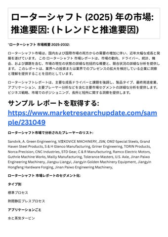 4. 投資機会: レポートは、成⻑の可能性や競争環境など、ローターシャフト市場における投資機会に 関する情報を提供します。