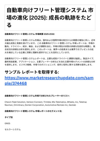 1. 市場の洞察: このレポートは、市場規模、成⻑率、セグメンテーション、競争環境など、⾃動⾞向 けフリ ト管理システム市場に関する貴重な洞察を提供します。