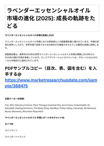 市場のダイナミクスと発展における⼤きな変化と評価 業界規模とシェア分析、業界の成⻑とトレンド。 新たな主要セグメントと地域 主要マーケットプレーヤーによる主要事業戦略とその主要⼿法 調査レポ トは、グロ バルおよび地域レベルでのラベンダ エッセンシャルオイル市場の 規模、シェア、傾向、および成⻑分析を網羅しています。