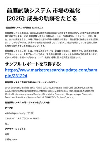 4. 投資機会: レポートは、成⻑の可能性や競争環境など、前庭試験システム市場における投資機会に 関する情報を提供します。