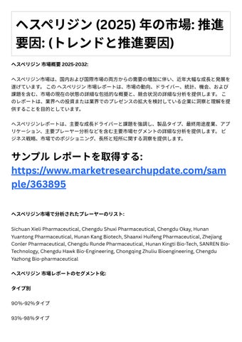 4. 投資機会: レポ トは、成⻑の可能性や競争環境など、ヘスペリジン市場における投資機会に関す る情報を提供します。