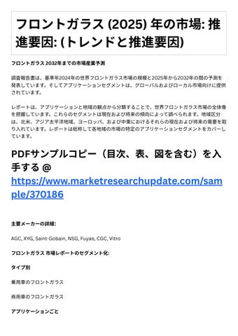 レポートは、アプリケーションと地域の観点から分類することで、世界フロントガラス市場の全体像 を把握しています。これらのセグメントは現在および将来の傾向によって調べられます。地域区分 は、北⽶、アジア太平洋地域、ヨーロッパ、および中東におけるそれらの現在および将来の需要を取 り⼊れています。レポートは総称して各地域の市場の特定のアプリケーションセグメントをカバーし ています。