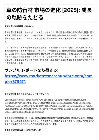 4. 投資機会: レポ トは、成⻑の可能性や競争環境など、⾞の防⾳材市場における投資機会に関する 情報を提供します。