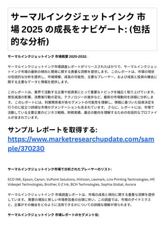 サ マルインクジェットインク市場調査レポ トがリリ スされたばかりで、サーマルインクジェッ トインク市場の最新の傾向と開発に関する貴重な洞察を提供します。このレポートは、市場の現状 の包括的な分析を提供し、市場規模、成⻑の可能性、主要なプレーヤー、および成⻑と投資の機会に 関する主要なデ タと情報を提供します。