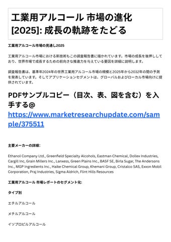 調査レポートは、グローバルおよび地域レベルでの⼯業⽤アルコール市場の規模、シェア、 傾向、および成⻑分析を網羅しています。