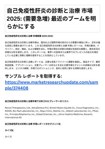 ⾃⼰免疫性肝炎の診断と治療レポ トは、主要な成⻑ドライバ と課題を強調し、製品タイプ、最終 ⽤途産業、アプリケ ション、主要プレ ヤ 分析などを含む主要市場セグメントの詳細な分析を提 供します。ビジネス戦略、市場でのポジショニング、⻑所と短所に関する洞察を提供します。