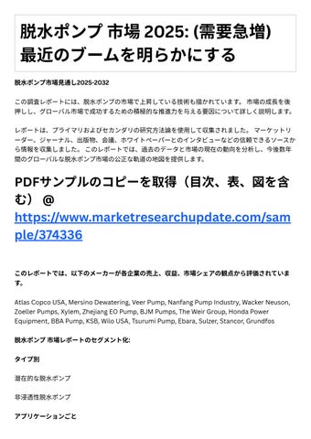 この調査レポートには、脱⽔ポンプの市場で上昇している技術も描かれています。市場の成⻑を後 押しし、グローバル市場で成功するための積極的な推進⼒を与える要因について詳しく説明します。