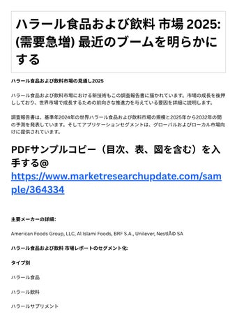 結論として、ハラール⻝品および飲料市場レポートは、指数関数的にあなたのビジネスを加速する市 場データにアクセスするための信頼できる情報源です。レポートは、主要なロケール、項⽬値を含む 経済シナリオ、利益、供給、制限、⽣成、要求、市場開発率、および数字などを提供します。その 上、レポートは新しいタスクSWOT分析、投機達成可能性調査、およびベンチャーリターン調査を提 ⽰します。