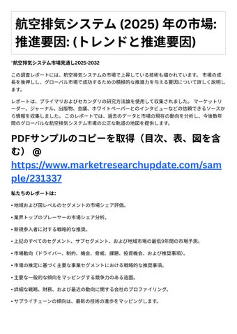 完全なレポートを取得 @ https://www.marketresearchupdate.com/indu stry-growth/aviation-exhaust-system-market2022-231337 最終的に、このレポ トは、他の調査レポ トやデ タソ スを参照することなく、市場のあらゆる 事実を明確に表⽰します。私たちのレポートは、当該市場の過去、現在、未来に関するすべての事 実を提供します。