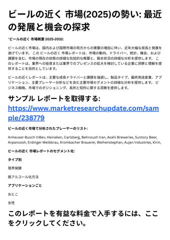 ビールの近く市場は、国内および国際市場の両⽅からの需要の増加に伴い、近年⼤幅な成⻑と発展を 遂げています。このビールの近く市場レポートは、市場の動向、ドライバー、統計、機会、および 課題を含む、市場の現在の状態の詳細な包括的な概要と、競合状況の詳細な分析を提供します。こ
