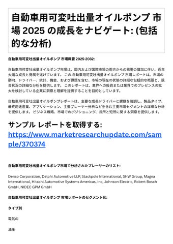4. 投資機会: レポ トは、成⻑の可能性や競争環境など、⾃動⾞⽤可変吐出量オイルポンプ市場にお ける投資機会に関する情報を提供します。