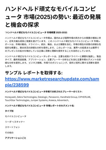 ハンドヘルド頑丈なモバイルコンピュータ市場概要 2025-2032: ハンドヘルド頑丈なモバイルコンピュータ市場は、国内および国際市場の両⽅からの需要の増加に伴 い、近年⼤幅な成⻑と発展を遂げています。このハンドヘルド頑丈なモバイルコンピュータ市場レ ポートは、市場の動向、ドライバー、統計、機会、および課題を含む、市場の現在の状態の詳細な包 括的な概要と、競合状況の詳細な分析を提供します。このレポ トは、業界への投資または業界で のプレゼンスの拡⼤を検討している企業に洞察と理解を提供することを⽬的としています。