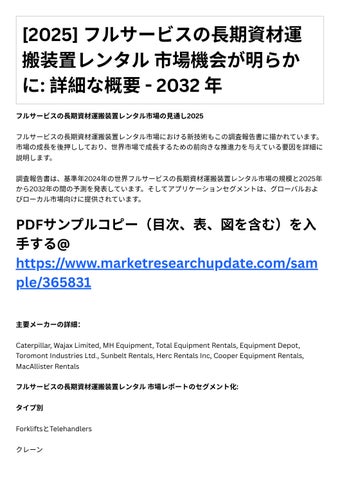 フルサ ビスの⻑期資材運搬装置レンタル市場における新技術もこの調査報告書に描かれています。 市場の成⻑を後押ししており、世界市場で成⻑するための前向きな推進⼒を与えている要因を詳細に 説明します。