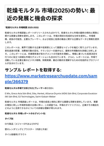 4. 投資機会: レポ トは、成⻑の可能性や競争環境など、乾燥モルタル市場における投資機会に関す る情報を提供します。