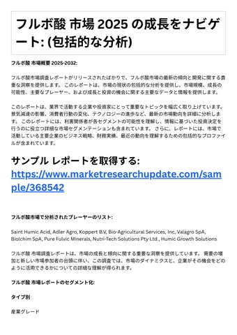 4. 投資機会: レポ トは、成⻑の可能性や競争環境など、フルボ酸市場における投資機会に関する情 報を提供します。