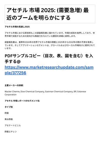 新たな主要セグメントと地域 主要マ ケットプレ ヤ による主要事業戦略とその主要⼿法 調査レポートは、グローバルおよび地域レベルでのアセチル市場の規模、シェア、傾向、お よび成⻑分析を網羅しています。