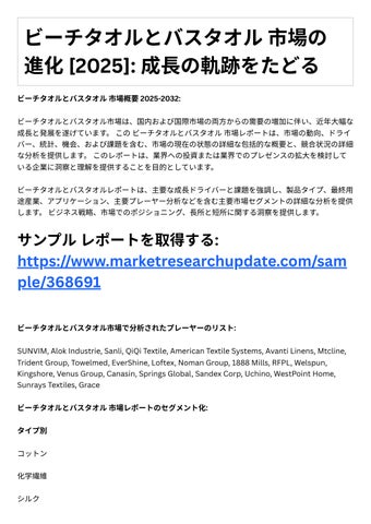 4. 投資機会: レポートは、成⻑の可能性や競争環境など、ビーチタオルとバスタオル市場における投 資機会に関する情報を提供します。
