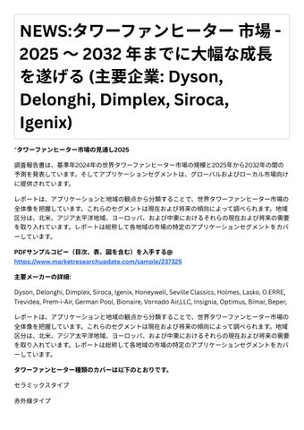 結論として、タワーファンヒーター市場レポートは、指数関数的にあなたのビジネスを加速する市場 デ タにアクセスするための信頼できる情報源です。レポ トは、主要なロケール、項⽬値を含む経 済シナリオ、利益、供給、制限、⽣成、要求、市場開発率、および数字などを提供します。その上、 レポートは新しいタスクSWOT分析、投機達成可能性調査、およびベンチャーリターン調査を提⽰し ます。