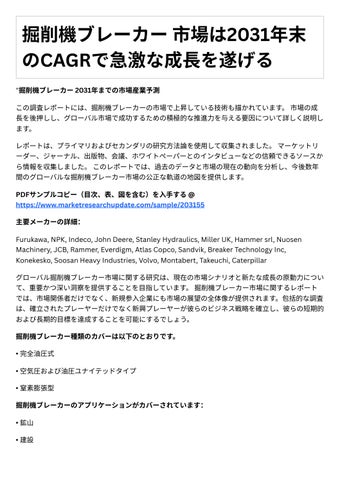 新たな主要セグメントと地域 主要マ ケットプレ ヤ による主要事業戦略とその主要⼿法 調査レポートは、グローバルおよび地域レベルでの掘削機ブレーカー市場の規模、シェア、傾 向、および成⻑分析を網羅しています。
