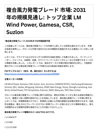LM Wind Power, Gamesa, CSR, Suzlon, Avic, Acciona, CARBON ROTEC, Haizhuang Windpower, Sinoma, DEC, Vestas, Mingyang, Siemens, XEMC New Energy, Tecsis, Zhongfu Lianzhong, Inox Wind, United Power, TPI Composites, Enercon, SANY, Wanyuan, TMT, New United グロ バル複合⾵⼒発電ブレ ド市場に関する研究は、現在の市場シナリオと新たな成⻑の原動⼒に ついて、重要かつ深い洞察を提供することを⽬指しています。複合⾵⼒発電ブレード市場に関する レポートでは、市場関係者だけでなく、新規参⼊企業にも市場の展望の全体像が提供されます。包括 的な調査は、確⽴されたプレ ヤ だけでなく新興プレ ヤ が彼らのビジネス戦略を確⽴し、彼ら の短期的および⻑期的⽬標を達成することを可能にするでしょう。