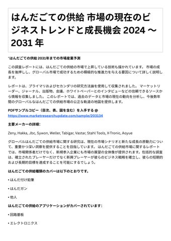 はんだごての供給 市場の現在のビ ジネストレンドと成長機会 2024 ~ 2031 年 "はんだごての供給 2031年までの市場産業予測 この調査レポートには、はんだごての供給の市場で上昇している技術も描かれています。 市場の成 長を後押しし、グローバル市場で成功するための積極的な推進力を与える要因について詳しく説明し ます。 レポートは、プライマリおよびセカンダリの研究方法論を使用して収集されました。 マーケットリ ーダー、ジャーナル、出版物、会議、ホワイトペーパーとのインタビューなどの信頼できるソースか ら情報を収集しました。 このレポートでは、過去のデータと市場の現在の動向を分析し、今後数年 間のグローバルなはんだごての供給市場の公正な軌道の地図を提供します。 PDFサンプルコピー(目次、表、図を含む)を入手する @ https://www.marketresearchupdate.com/sample/203134 主要メーカーの詳細: Zeny, Hakka, Jbc, Sywon, Weller, Tabigar, Vastar, Stahl Tools, X-Tronic, Aoyue グローバルはんだごての供給市場に関する研究は、現在の市場シナリオと新たな成長の原動力につい て、重要かつ深い洞察を提供することを目指しています。 はんだごての供給市場に関するレポート では、市場関係者だけでなく、新規参入企業にも市場の展望の全体像が提供されます。包括的な調査 は、確立されたプレーヤーだけでなく新興プレーヤーが彼らのビジネス戦略を確立し、彼らの短期的 および長期的目標を達成することを可能にするでしょう。 はんだごての供給種類のカバーは以下のとおりです。 • はんだ付け鉛筆 • はんだガン • 他人 はんだごての供給のアプリケーションがカバーされています: • 回路基板 • エレクトロニクス