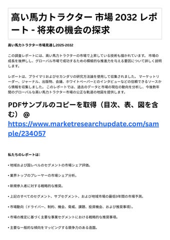 この調査レポートには、⾼い⾺⼒トラクターの市場で上昇している技術も描かれています。市場の 成⻑を後押しし、グローバル市場で成功するための積極的な推進⼒を与える要因について詳しく説明 します。