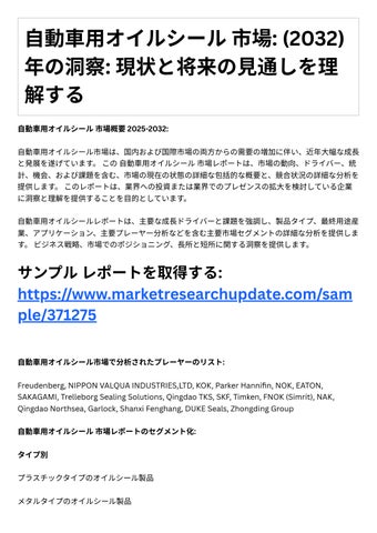 4. 投資機会: レポ トは、成⻑の可能性や競争環境など、⾃動⾞⽤オイルシ ル市場における投資機 会に関する情報を提供します。
